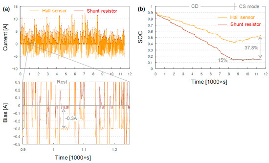 (a) Current sensor bias demonstrated during the city profile, (b) which affects the accuracy of SOC estimation.