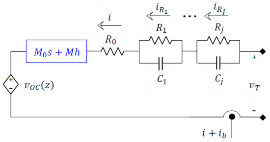 The next stage is to formulate the cell model and identify its parameters (Stages 2.1 and 2.2). This study exploited the Thevenin and ESC models. The Thevenin model is considered the most representative form of ECMs. This model captures the time-varying polarization voltages simply using one or more parallel resistor-capacitor elements. The ESC model is an advanced form of the Thevenin model. As shown in Figure 7, this model captures the SOC-varying and instantaneous hysteresis voltages using an additional element connected in series to the R-C elements. These models were developed using an evolutionary approach, allowing for the gradual incorporation of relevant model states to more accurately predict the cell’s transient behavior. Overall, the output (terminal voltage) is predicted in response to the input (current flowing through (ohmic resistance)). The Thevenin model to estimate the SOC is formed by first incorporating the states, (current flowing through and (polarization resistance and capacitance) and (SOC)). Then, the state (current bias) is added to the input to account for the current sensor bias. Finally, the addition of the state (hysteresis voltage) and input (instantaneous hysteresis voltage) completes the ESC model. The resulting non-linear system model and measurement function of the ESC model are described separately in Appendix A for the sake of brevity.
