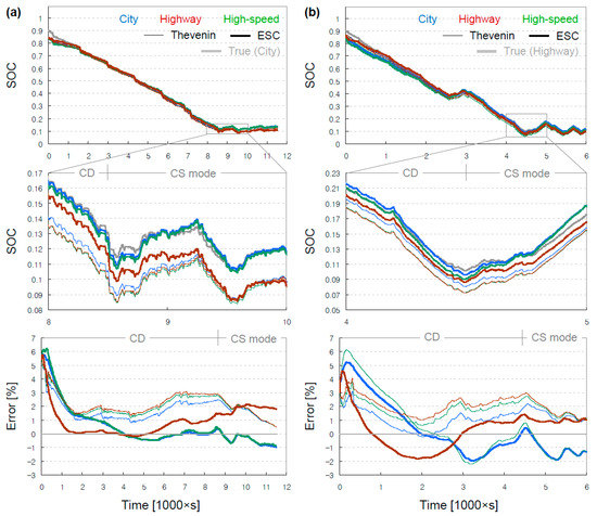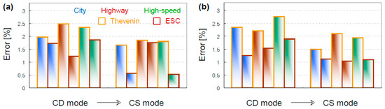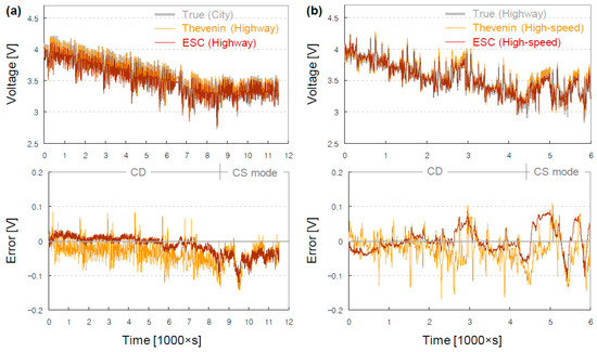 In accordance with the framework outlined in the preceding section, six models were constructed by applying the three load profiles to the two cell models. These models are named after the load profile used for modeling. For instance, either Thevenin or ESC model based on the City profile is called the City model hereinafter. The results are presented in Table 4. It is noted that the hysteresis voltage parameters are only available for the ESC model. The uniformity of the polarization voltage parameters for the same load profile is a result of subspace system identification employed to directly solve for before iteratively solving for other parameters. Table 5 lists the resulting RMSEs of the predicted terminal voltages for each load profile, cell model, and operational mode. It is noted that the CS mode is unavailable for the High-speed profile. Figure 8 plots the measured and predicted voltages along with their error, comparing modeling accuracy across the operational modes. Due to space constraints, it is difficult to plot all cases. Instead, the worst RMSE case was selected for each load profile, which are (a) the Highway model validated with the City profile and (b) the High-speed model tested using the Highway profile. The results indicate that the ESC model generally outperforms the Thevenin model in terminal voltage prediction. In both models, their error increases as the mode shifts from CD to CS, as was noted in Table 5. The reason is due to limitations in representing battery behavior at low SOCs, around 15%. However, this tendency is less severe in the ESC model. Although the error pattern of the two models looks similar in the CS mode, as shown in lower Figure 8, greater accuracy is obtained by the ESC model as a consequence of the inclusion of the hysteresis voltage state and its parameter. The results also demonstrate that a load profile used for modeling has no significant impact on modeling accuracy. That is, the High-speed models (CD mode only) exhibit comparable RMSEs to those produced by other models (CD and CS modes).