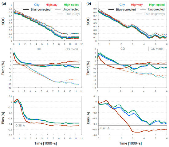 Evaluation of SOC estimation accuracy with bias correction under the (a) City and (b) Highway profiles.