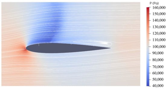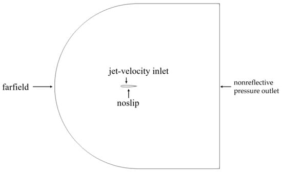 Referring to Harris’s experiment [19] to set the physical parameters of the forward incoming flow at the entrance, the Mach number is , the far-field pressure is , the far-field static temperature is , and the angle of attack is . The value of k is set as 0.01, and the value of is set as 10 for the farfield conditions; the k and for jet inlet are set as zeroGradient, which is the Neumann boundary condition in OpenFOAM.