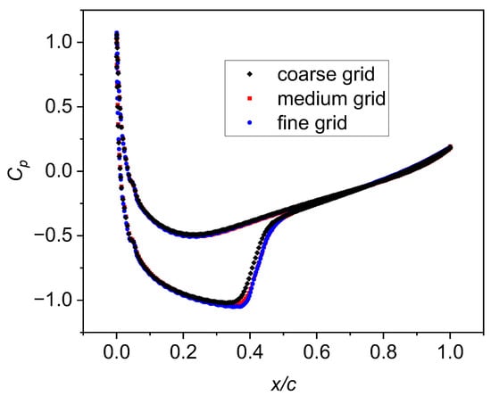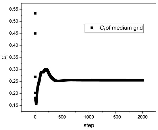 Figure 3 depicts the grid-independent verification of the transonic wing, which uses the pressure coefficient of the wing surface as the criterion. The mesh settings in the middle are illustrated in Figure 1, with a total of approximately 8 million meshes. The number of nodes in the coarse grid and fine grid is scaled up by 1.2 times. The coarse grid consists of approximately 5 million meshes, while the fine grid comprises approximately 14 million meshes. Figure 3 displays the pressure distributions on the three mesh surfaces. The shock pressure distributions in the coarse mesh are nearer to the leading edge of the wing, whereas the pressure distributions in the medium and fine meshes are consistent, verifying the grid’s independence. Figure 4 shows convergence graph of . When the number of steps is 1967, the change in the value of is less than 0.0001, which means that converges.
