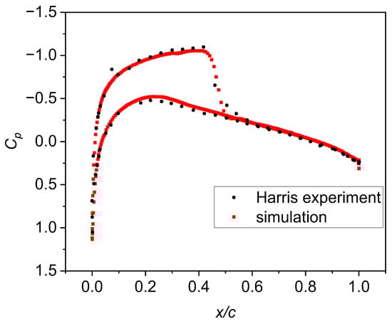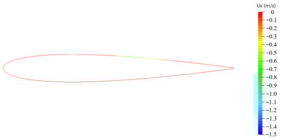 Figure 5 shows the simulation result of the pressure distribution on the wing surface. Compared with Harris’s experimental data [19], the pressure distribution on the upper and lower surfaces is basically the same, with a maximum error of less than 2%. It can also be seen from the pressure distribution that the boundary layer interference structure of shock waves is clear, as well as the wave separation after the presence of shock waves. Figure 6 shows the flow velocity diagram of the wing center section, showing a velocity of less than 0, and the velocity greater than 0 is shown in red. From Figure 6, it can be observed that there is a clear backflow area (negative velocity) on the wing surface, which is caused by the flow separation caused by SBLI and is a hazard caused by SBLI.