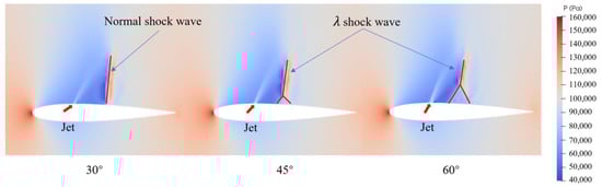 The boundary layer interference of transonic shock waves is analyzed at different pitch angles of 30°, 45° and 60°. Figure 7 shows the pressure cloud image near the wing at 30°, 45°, and 60° jets. Figure 8 shows the pressure cloud image with streamlines when jet angle is 60°. Figure 7 shows that, with increasing jet angle, the shock wave gradually develops from a normal shock from the wall into λ shock waves in which the two oblique shock wave intensities are weaker, reducing the strength of the shock wave. The greater the angle, the larger the λ shock wave.