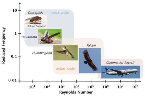 Flying animals such as birds and insects can fly effectively in complex and diverse environments. They have high flight efficiency, maneuverability, and environmental adaptability—characteristics that are difficult for human-made aircraft to replicate [,,]. Various studies have been conducted to develop flapping-wing air vehicles (FWAVs) that mimic the excellent flight characteristics of these flying animals. Flying animals fly at a relatively lower Reynolds number than existing manned aerial vehicles, as shown in Figure 1 []. The Reynolds number is a dimensionless quantity that represents the ratio of inertial forces to viscous forces of a fluid. The reduced frequency is a dimensionless number representing the ratio of forward speed and flapping frequency. However, unmanned aerial vehicles (UAVs) operating in the low Reynolds number region can be improved by applying these advantageous animal flight characteristics.