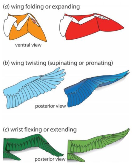 Wing motions of flying animals (a) wing folding, (b) wing twisting, and (c) wrist flexing. Reprinted with permission from Ref. []. 2015, Canadian Science Publishing.