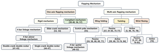Classification of flapping mechanism: one-axis flapping mechanism vs. multi-axis flapping mechanism [,,,,,,,,,,,,,,,,,,,,,,,,,,,,,,,,,,,,,,,,,,,,,,,,].
