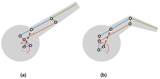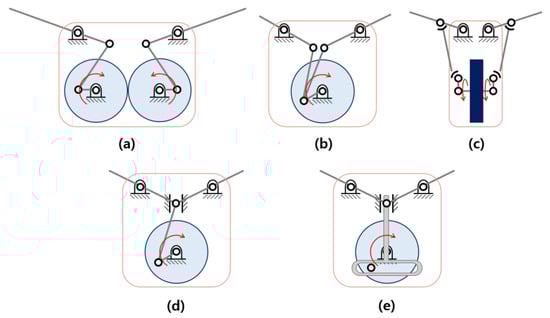 There are also double-crank double-rocker mechanisms (Figure 4a) and single-crank double-rocker mechanisms (Figure 4b) based on the four-bar planar linkage mechanism. The single-crank double-rocker mechanism has a relatively small body width because it can drive two couplers and rockers by one crank; however, a phase difference between both wings occurs, causing asymmetric wing motion. Wang et al. [] addressed this issue by defining the phase difference of both wings as the optimization problem. Meanwhile, the double-crank double-rocker mechanism can drive each rocker with each crank, and the two cranks are driven simultaneously with a pair of gears without phase difference between both wings. For this reason, the double-crank double-rocker mechanism has been used in many FWAVs.