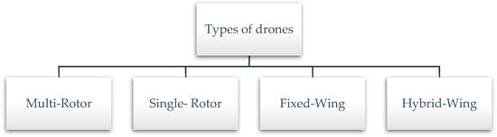 Drones are classified as multi-rotor, fixed-wing, single-rotor, or hybrid-wing (Figure 1) [10].