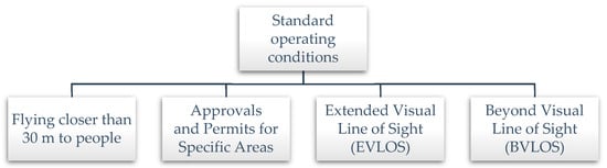 Recreational users adhere to what is formally referred to as “standard operating conditions”, which are intended to safeguard both the operator and the surrounding community. They include flying only one unmanned aerial vehicle at a time and staying within visual line of sight (VLOS) [18]. Flights must stay below 120 m (400 feet) above ground level, no closer than 30 m to people, and never over or above people. Operators must avoid flying near emergency situations, in forbidden or restricted airspace, and within 5.5 km of a regulated aerodrome or airport. Recreational unmanned aerial vehicles (UAVs) are limited to a maximum weight of 2 kg [19].