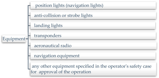 - Beyond visual line of sight (BVLOS). With the exception of BVLOS operations, this classification of flights is not routinely permitted. Extended visual line of sight (EVLOS) flight is a comparable operating category in which the remote pilot does not have direct visual sight of the remotely piloted aircraft (RPA) [20]. However, with the assistance of certified RPA observers (individuals who demonstrate proficiency in accordance with the operator’s approved training criteria), the remote pilot can still ensure the RPA’s safe operation [18]. Throughout these flights, at least one member of the remote crew will be able to see all portions of the intended operational airspace at all times. Physical impediments and weather circumstances should be considered in this assessment. Electronic aids, such as on-screen or moving-map displays and first-person perspective, may be utilised to assist the remote pilot in safely operating the aircraft, but they cannot replace direct eye contact [18]. BVLOS (including flight in non-visual meteorological circumstances) and EVLOS approvals are in addition to the regular ReOC privileges; however, they may be given by CASA [18]. To execute a BVLOS flight, the RePL holder who will fly the aircraft must possess a BVLOS flying licence. The applicant for this licence must pass at least one of the following exams: “an aeronautical knowledge examination for an instrument rating pursuant to Part 61; the former instrument theory examination (IREX) pursuant to Part 5 of the Civil Aviation Regulations 1988 (CAR); or an approved examination for this purpose”. Additionally, CASA requires operators to complete a case-by-case risk assessment and mitigation approach prior to submitting an application to operate BVLOS. Besides, the following equipment must be installed on the RPA and operable for BVLOS flight as shown in Figure 3. Furthermore, special clearance may be granted for flights over densely populated regions [18].