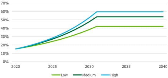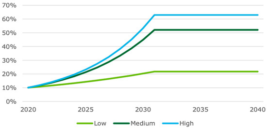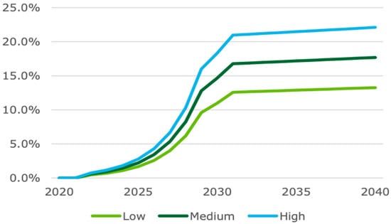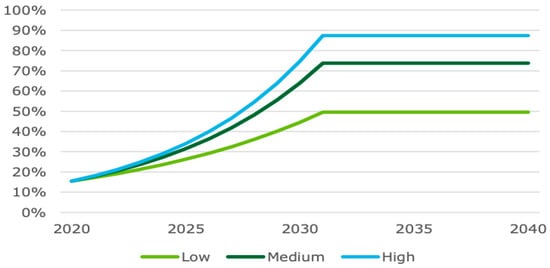 UAV technology has been used in agriculture to monitor pests and diseases, spot spray pesticides, spray fertilisers, identify crop damage, conserve natural resources, evaluate soil condition, and manage water use [21,22]. Logan [23] states that many companies in Australia are developing drones for the aim of monitoring crop health using infrared mapping (e.g., using the normalised difference vegetation index (NDVI)) in order to offer early warning of crop stress and crop health concerns on farmland. Zuo, Wheeler, and Sun [24] investigated 1000 farmers in Australia’s southern Murray–Darling basin. They found that just 4 to 8% of farmers in various agricultural businesses have used drone technology. However, up to one-third of farmers said they planned to utilise drones in the next five years, with application more likely to occur if irrigators can gain tangible benefits, for example, water and labour savings. According to DAE [25], drones are employed in agricultural enterprises for around 10% of the Australian agricultural market. ABS innovation data shows 1 in 10 agricultural, fishery and forestry firms developed a new or considerably enhanced operating process, and it also forecasts the future adoption rate of drones in agriculture. Figure 4 shows the increasing trends in the low, medium, and high uptake scenarios from 2020 to 2025.