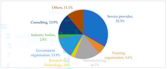 Figure 11 shows the organisation type those participants worked in. There were 33% of participants from drone service providers; 16.7% of participants from manufacturing; 13.9% of participants from consulting companies; 13.9% of participants from government organisations; 5.6% of participants from training organisations; 2.8% of participants from industry bodies; and 2.8% of participants from the research and technology fields.