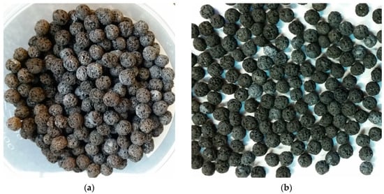 The experimental part of the research consisted of 32 single-run hot tests. Every test was performed with a fresh catalyst bed, in order to exclude any discussion on the impact of the catalyst health on test results. Platinum, supported on a γ-alumina carrier, is a standard, commercially available, product. The active phase content of the catalyst (see Figure 1) was 5% by mass. The second one (see Figure 2), manganese oxide catalyst (silica-doped α-alumina supported), was developed by Łukasiewicz—Institute of Aviation and reported in [32,33]. This catalyst was prepared by wet impregnation in a potassium permanganate water solution [34]. The active phase, containing manganese oxides, provides satisfying response time without preheating [35]. The active phase content of the catalyst, after the impregnation–drying–calcination process, reached 4.5% by mass.