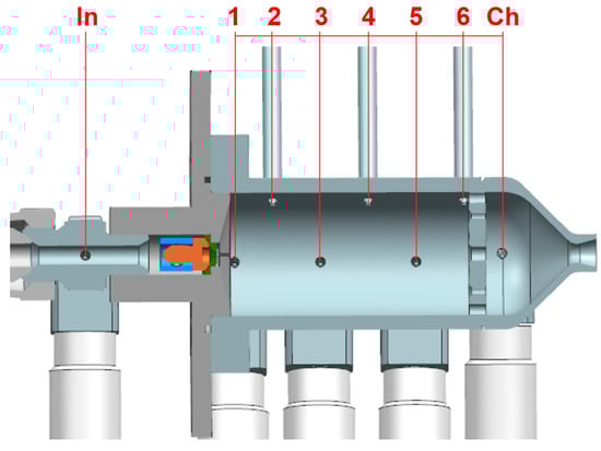 Location of measurement ports (sections): In—inlet, 1–6—catalytic chamber, Ch—expansion chamber.