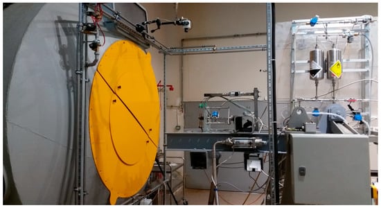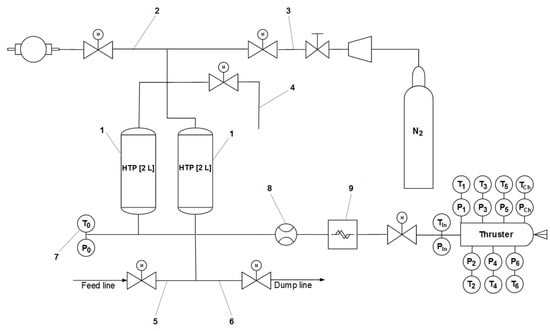 As depicted in Figure 4, the system comprised two 2 L tanks (1) and was equipped with several essential components to ensure proper fuelling and testing procedures. The vacuum line (2) served the purpose of evacuating the air during loading of the HTP, while the pressurization line (3) provided high-pressure nitrogen to the system. The gas relief valve line (4) allowed for safe depressurization of the system, while the fuelling line (5) was responsible for propellant filling. The liquid dump line (6) served to empty the system of the propellant, whenever needed. Additionally, the system featured measurement ports (7) in the feeding line to monitor pressure and temperature during testing. The feeding line was equipped with two flow meters, including a turbine meter (8) for volumetric flow measurement and a Coriolis mass flow meter (9), both of which were used to improve the accuracy of test results. All the hot tests were performed in the special internal facility at Łukasiewicz—Institute of Aviation (see Figure 5).