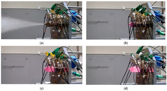 Since the adiabatic decomposition temperatures of 85.2% and 99% hydrogen peroxide were 891 K and 1235 K, respectively, and for the given nozzle, the outlet temperatures were 546 K and 781 K, respectively, complete decomposition should generate invisible outflow in every test. The visual image, presented in Figure 6a, suggests incomplete decomposition of the propellant. In contrast, images (c) and (d) suggest the location of the complete decomposition plane in upstream parts of these beds. The difference in the shade results from various gas temperatures.