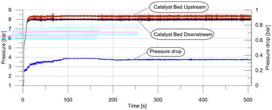 Upstream and downstream pressure and pressure drop measured during the testing of a 5% Pt/Al2O3 catalyst for the decomposition of 97.8% hydrogen peroxide (test number 31).