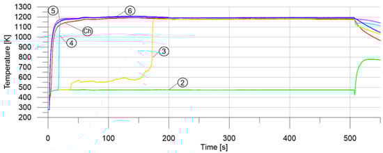 Temperature in different sections of the thruster measured during the testing of a 5% Pt/Al2O3 catalyst for the decomposition of 97.8% hydrogen peroxide (test number 31): 2–6—subsequent sections of the catalyst bed, Ch—expansion chamber.