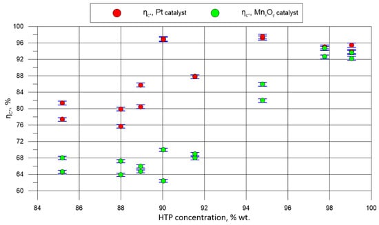 In general, it can be noticed that ηc* rises with the propellant concentration. The alumina-supported platinum catalyst, performing better than manganese oxides, reached its maximum efficiency with approximately 95% HTP. In the case of the other catalyst, the rising characteristics of ηc* vs. propellant concentration was maintained up to 99% peroxide. The explanation of this difference lays in the energy balance and heat loss from the catalyst bed to the environment, reaching its maximum with the highest decomposition temperature (for 99% HTP) and heat exchange area (related to the location of the full-decomposition plane). The higher the activity, the greater the area of the wall that reaches the maximum temperature. The complete decomposition of peroxide with the less active MnxOy-based catalyst occurred further downstream (with respect to the injector location) than with the platinum catalyst. Thus, the heat loss to the wall was always lower with manganese oxides for this design.