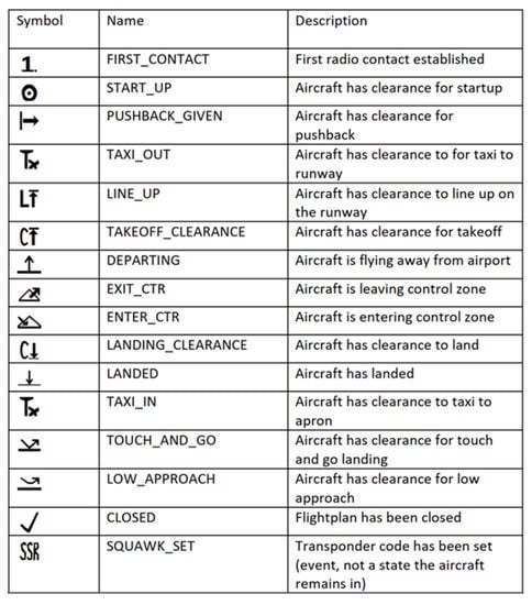Flight status icons of electronic flight strips available depending on the current flight status [29].