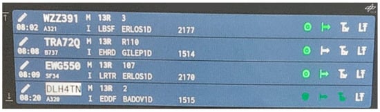 The ABSR output was visible through different highlighting mechanisms in the electronic flight strips if the validation condition “with ABSR support” was active. If a callsign was recognized [31], the callsign was highlighted by displaying a rectangle in inverted colors for ten seconds at the callsign field of the flight strip (see “DLH4TN” in Figure 5). The callsign was highlighted immediately after being recognized and extracted even before the ATCo finished the utterance by releasing the push-to-talk button.