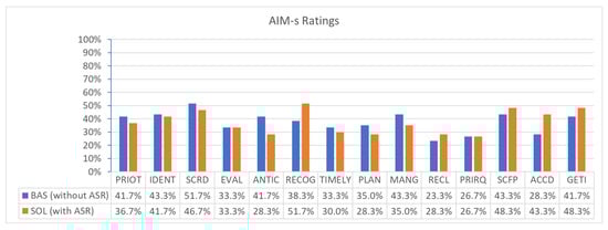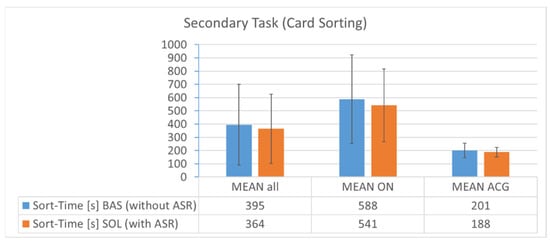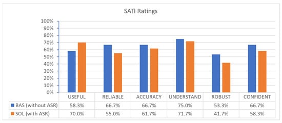 Furthermore, the 15 pairwise comparisons of workload contributing factors have been analyzed. When looking at the subscores for all six NASA-TLX dimensions, half of them (three) were rated equal or better in SOL compared to BAS (PD, EF, FR), and the other half was rated vice versa (MD, TD, OP). In general, physical demand (PD, 3.3%) was rated as being a less important contributor to workload, and mental demand (MD, 23.3%) was the most important contributor to workload. The other four dimensions were rather equally important contributors to the overall workload (TD 22%, OP 18%, EF 16.7%, FR 16.7%). The horizontal axis in Figure A1 shows the weight; the area shows the contribution of this very dimension to the OW of BAS and SOL conditions, respectively.
