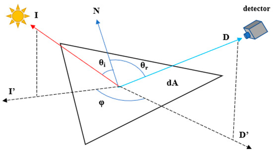 where fr is the bidirectional reflectance distribution function (BRDF) of the surface element, which is a function describing the material properties of the surface; Abs is the light absorption rate of the surface element microstructure; dAk is the area of the kth surface element; θi is the incident zenith angle, that is, the angle between the sun vector and the normal vector N of the panel; θr is the observation zenith angle, that is, the angle between the observation vector and the normal vector N of the panel; and φ is the observation azimuth, that is, the angle between the projections I’ and D’ of the sun vector I and the observation vector D on surfel dA.