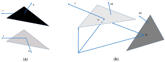It can be seen from the above that the OCS calculation for the surface elements is the key to determining the magnitude of the spacecraft. However, due to the complex surface structure and illumination of the spacecraft, after surfel division is performed, it is necessary to judge the occlusion of the surfels. The occluded surfels are invalid surfels and should be eliminated in the calculation. The occlusion here includes both self- and mutual occlusion. Self-occlusion determines whether the panel is illuminated by sunlight, as shown in Figure 2a. In Figure 2, i is the incident sun vector and n, n1 and n2 are the normal vectors of the panels. Self-occlusion judgment is relatively simple, and the vector judgment method is used. Mutual occlusion means whether face element A is occluded by face element B, as in Figure 2b.