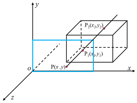 As shown in Figure 3, the xoy plane is the projection plane, and the z-axis is the viewing direction. Pass through any pixel point P(x, y) on the screen to make a ray parallel to the z-axis, and intersect the surface of the object at points P1 and P2. Then, the Z-buffer algorithm compares the z values of P1 and P2 and stores the largest z value. Obviously, the information of P1 is displayed on the screen as P(x, y). Because the surface of the satellite is complex and the materials are not consistent, this paper improves the traditional Z-buffer algorithm and stores the material information of the bins in the buffer to facilitate subsequent processing and calculation.
