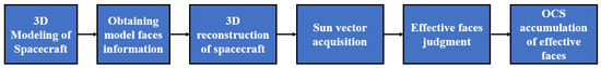 Figure 4 shows the steps of the spacecraft OCS calculation based on Z-buffer graphic blanking, including 3D model surfel division, surfel information acquisition, sun vector acquisition, valid surfel judgment and surfel OCS stacking.