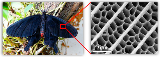 - Zhu, S.; Zhang, D.; Chen, Z.; Gu, J.; Li, W.; Jiang, H.; Zhou, G. A simple and effective approach towards biomimetic replication of photonic structures from butterfly wings. Nanotechnology 2009, 20, 315303. [Google Scholar] [CrossRef]