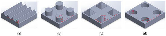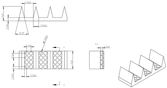 Based on the above analysis and inspired by the microstructured surface of the butterfly wing (Figure 5) with a groove–hole combination, this paper designs a composite optical stealth surface with a V-groove array as the main structure and a hole-like structure in the groove gaps as an additional structure, as shown in Figure 11.