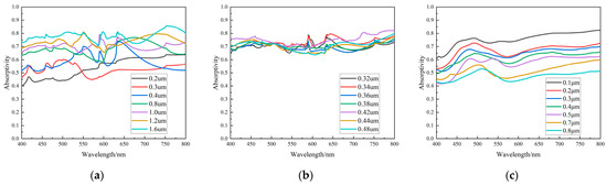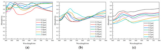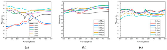 For the above configurations, analysis of the optical properties corresponding to the microstructures can be performed through applying the finite difference time domain method [21] (FDTD) to obtain the Abs parameters. The microstructure models were built in the FDTD Solutions software, the incident light wavelength was set to 400–800 nm in the visible light range and the widely used metal Al was used as the material. The Abs values of the four configurations of “V-groove array”, “cylindrical array”, “pyramidal array” and “circular hole array” in Figure 6 were calculated at different wavelengths. The results are shown in Figure 7, Figure 8, Figure 9 and Figure 10. Multiscale optical characterization was also performed through adjusting key parameters of the microstructure, mainly the depth/height of the structure, the structural holes/diameters and the structural density (characterized by the spacing between adjacent units of the structure), to determine their effects on the light absorption rate. Of course, in the process of simulating any of the parameters, we will control the other parameters unchanged to better explain the influence of each parameter.