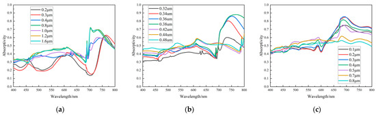 - Increasing the density of microstructures per unit area or increasing the height/depth of the structures can improve the light absorption properties. From Figure 7c, Figure 8c, Figure 9c and Figure 10c, it can be seen that when other scale factors are fixed, increasing the structural density can improve the absorption rate; Figure 7a, Figure 8a, Figure 9a and Figure 10a show that increasing the height or depth of the structure increases the light absorption rate.