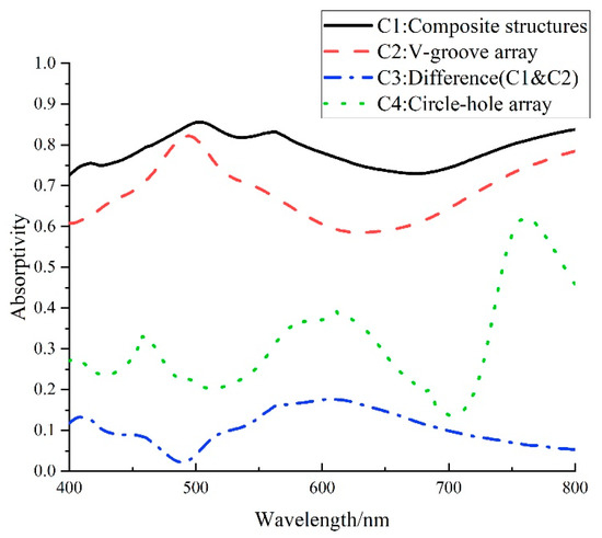 From Figure 12, comparing curves C1, C2 and C4, it is clear that the combination of the two micro/nanostructures results in a higher absorbance. It is worth noting that in the 500–70 nm band, the C2 curve is significantly concave, while the C4 absorbance curve of the corresponding hole-like structure is exactly convex. The curve for the combination of the two structures shows that the additional structure improves the low absorbance of the main structure in this band, and the composite structure can achieve an 80.18% absorption rate for visible light. The above conclusions show that the absorption rate can be optimized via combining different microstructures, but how the structures can be combined to achieve the optimum design will need to be further investigated.