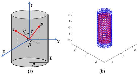In view of the analytical solution of the OCS of a simple geometry, this paper takes a Lambertian cylinder as the standard body, calculates the theoretical true value, and verifies the OCS algorithm based on graphic blanking proposed in this paper. The coordinate system XYZ shown in Figure 13a is established on the standard body, where OS in the figure is the light source vector, OD is the observation vector, the angle between OS and the y axis is η, the projection of OS on the XOZ plane coincides with the z axis, the angle between OD and the y axis is γ and the angle between the projection of OD on the XOZ plane and the z axis is β. If the hemispherical reflectance of the Lambertian cylinder is ρ2π, then its BRDF is ρ2π/π, and if the radius of the bottom surface of the cylinder is R, the height is L, and the standard solar irradiance is Esun, so the OCS expression of the Lambertian cylinder is [13]: