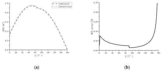 The simulation parameters are as follows: R = 1 m, L = 5 m, R’ = 0.8 m, L’ = 4 m, ρ2π = 0.5, β = 0°, η = 45°, the value range of γ is [0°, 180°] and the value interval is 1°, which means that the observation vector rotates from along the positive z−axis around the x−axis to along the negative z−axis by 1°/time. The OCS algorithm based on graphic blanking and the analytical method are used to calculate the OCS. The simulation results are shown in Figure 14a,b. The red curve in the figure is the analytical solution, which can be considered the true value, and the blue curve is the value simulated using the Z−buffer graphic blanking algorithm.