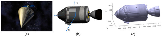 Spacecraft simulation modeling: (a) U.S. “Misty” series of stealth spacecraft; (b) simulation spacecraft model and coordinate system; (c) 3D reconstruction of the spacecraft.
