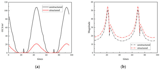 Figure 15 shows the observation results of the spacecraft before and after covering the micro/nanostructure on the surface obtained from the OCS calculation based on blanking, in which Figure 16a shows the comparison of the OCS simulation results and Figure 16b shows the comparison of the magnitude calculation results.
