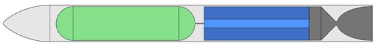 Simplified scheme of HRE with conventional configuration: The (liquid/gaseous) oxidizer tank is shown in green, while the solid-fuel grain (with a single central port perforation) is in blue.