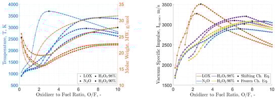 Cryogenic and storable oxidizers, theoretical performance by NASA-CEA code: adiabatic flame temperature and molar mass in the combustion chamber (left), vacuum specific impulse at exhaust (right). Paraffin-wax fuel (C50H102, heat of formation −1438.2 kJ/mol [72]). Calculations are performed for: (i) combustion-chamber pressure, MPa, (ii) shifting chemical equilibrium and frozen chemical equilibrium (freezing @ throat), (iii) supersonic exhaust-to-throat-area ratio of 40. Maxima are highlighted by stars.