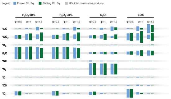 Exhaust composition from NASA-CEA for paraffin (C50H102, heat of formation −1438.2 kJ/mol [72]) burning with different oxidizers at equivalence ratios () in the range 0.5 to 1.5. Calculations are performed for: (i) combustion-chamber pressure, MPa; (ii) shifting chemical equilibrium and frozen chemical equilibrium (freezing @ throat); and (iii) supersonic exhaust-to-throat-area ratio of 40. * NASA-CEA thermodynamic properties fitted to 20,000 K.