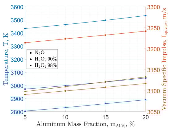 Paraffin fuel (C50H102, heat of formation −1438.2 kJ/mol [72]) burning with storable oxidizers: Theoretical performance by NASA-CEA. Maximum adiabatic flame temperature and vacuum specific impulse at exhaust for increasing energetic additive mass fraction, with Al as a case study. Calculations are performed for: (i) combustion-chamber pressure, MPa; (ii) shifting chemical equilibrium; and (iii) supersonic exhaust-to-throat area ratio of 40.