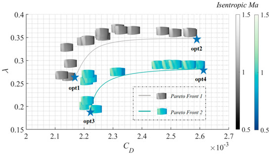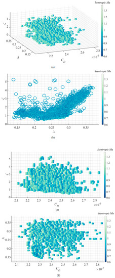 - Taking the laminar flow area and drag coefficient as design objectives, Pareto front curves are given under different drag divergence constraints. The geometric distribution and the surface isentropic Mach number distribution of 3D nacelles with different aerodynamic performance are analyzed to provide experience for the subsequent aerodynamic design of a 3D nacelle.