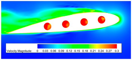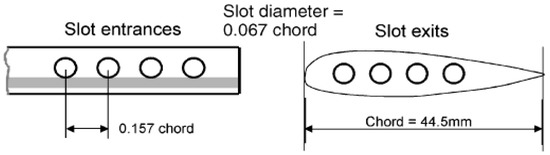 The distribution of the velocity magnitude near the slot exits is given in Figure 17, and the corresponding comparison of dimensionless mass flow rate is provided in Table 3, in which the slots are numbered from 1 to 4 from the leading edge to the trailing edge. The results indicates that the mass flow rate through slots decreases gradually from the second slot to the fourth one, which is partly consistent with the result of Ref. [13]. However, the result also manifests that the deficit of the velocity magnitude is obvious for the slots far away from the leading edge, which indicates the possibility of optimizing the layout and number of slots.