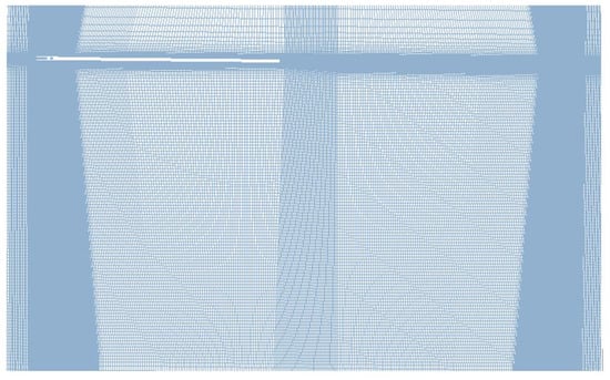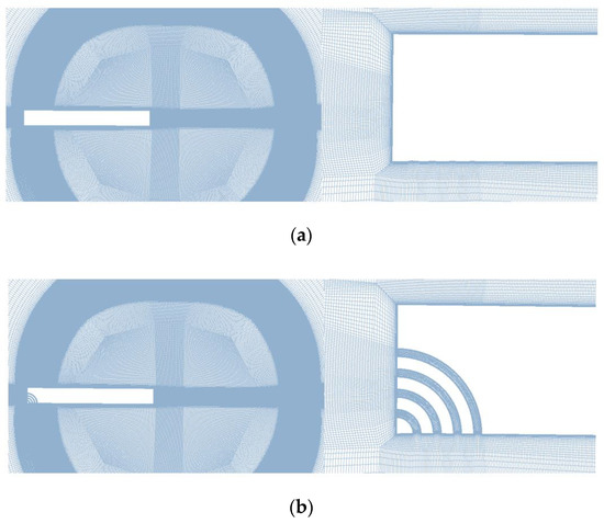 ICEM-Hexa is applied in the generation of multiblock structural grid for the baseline and slotted-tip blades. The O-topology is applied to describe the rotation flow field. For the numerical simulation issues with relative motions, the dynamic patched method is used as the grid generation strategy, which has the primary advantage of handling relative motion. Fluxes are interpolated through the patched surfaces, thus enabling the coupling of the flow information of the adjacent subdomains in the process of computation. Figure 3 depicts the grid of two blades. In order to accurately predict the influence of a slotted-tip on tip vortices, the grid topology and distribution of the baseline blade and the slotted-tip blade in the region of the tip vortices must be consistent, which can be ensured via the blocks of the slot set as the inner part while the inlet and outlet of slots are set as wall surfaces when the grid of slotted-tip blade needs to be switched to baseline. The grid distribution of the blade tip region is refined to capture the evolution of the vortex system and match the application of IDDES. In order to ensure the prediction of the blade tip vortices system while reducing the numerical dissipation, the size of the cells is set as equal to 2% of the length of the blade chord. The first cell height for the normal wall grids is set to to ensure y+ ≈ 1, and the whole grid of each blade consists of nodes. The sectional grid of the wake region is shown in Figure 4.