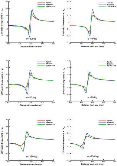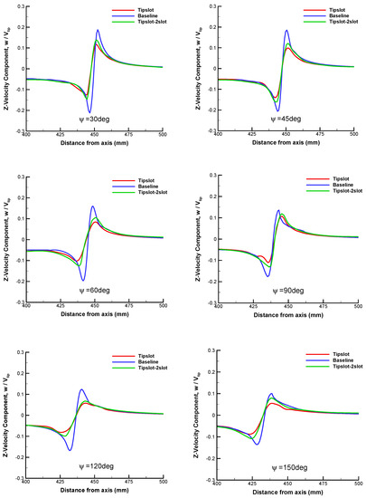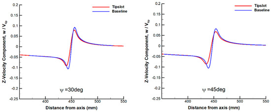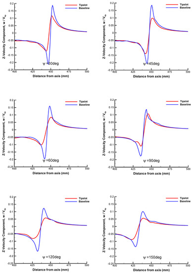 Figure 19 shows the comparison of velocity profiles of a tip vortex in the Z-direction at different wake ages. The peak value of the velocity component in the vicinity of vortex core is reduced by about 50% with the slotted blade, which indicates that the result of IDDES is much closer to the experimental conclusion presented in reference [11]. Meanwhile, the predicted vortex core diameter of the slotted blade is approximately doubled at each wake age compared to the baseline blade, which is demonstrated more clearly in Figure 20.