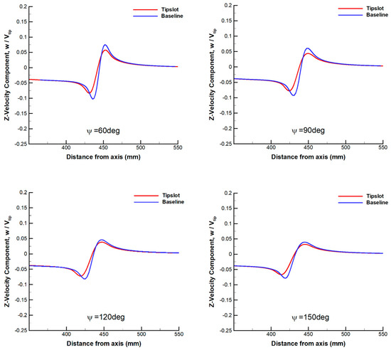 Comparison of velocity profiles in the Z-direction at different wake ages between the baseline blade and the slotted-tip blade.