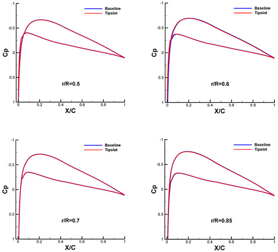Figure 10 compares the pressure distribution of the baseline and slotted blades in the radial direction. Little difference can be observed from the comparison of the two results, which proves that the slot has little impact on the rotor surface loading, thus it will not have great impacts on the aerodynamic performance of the rotor.